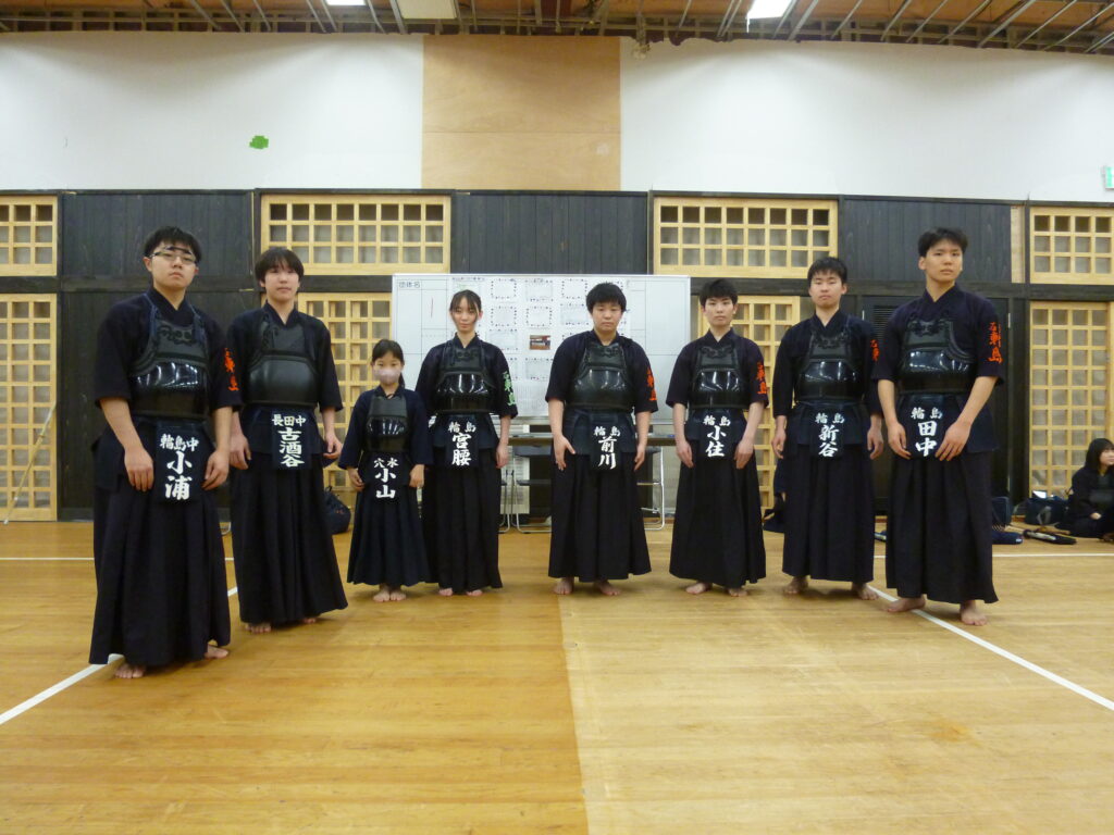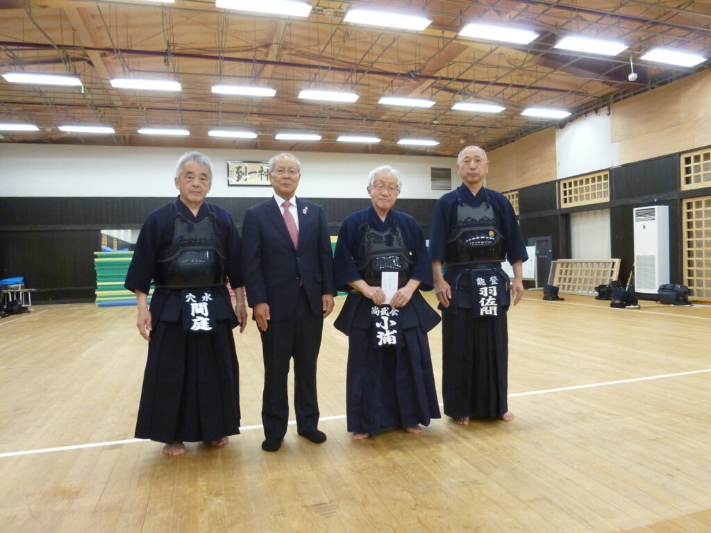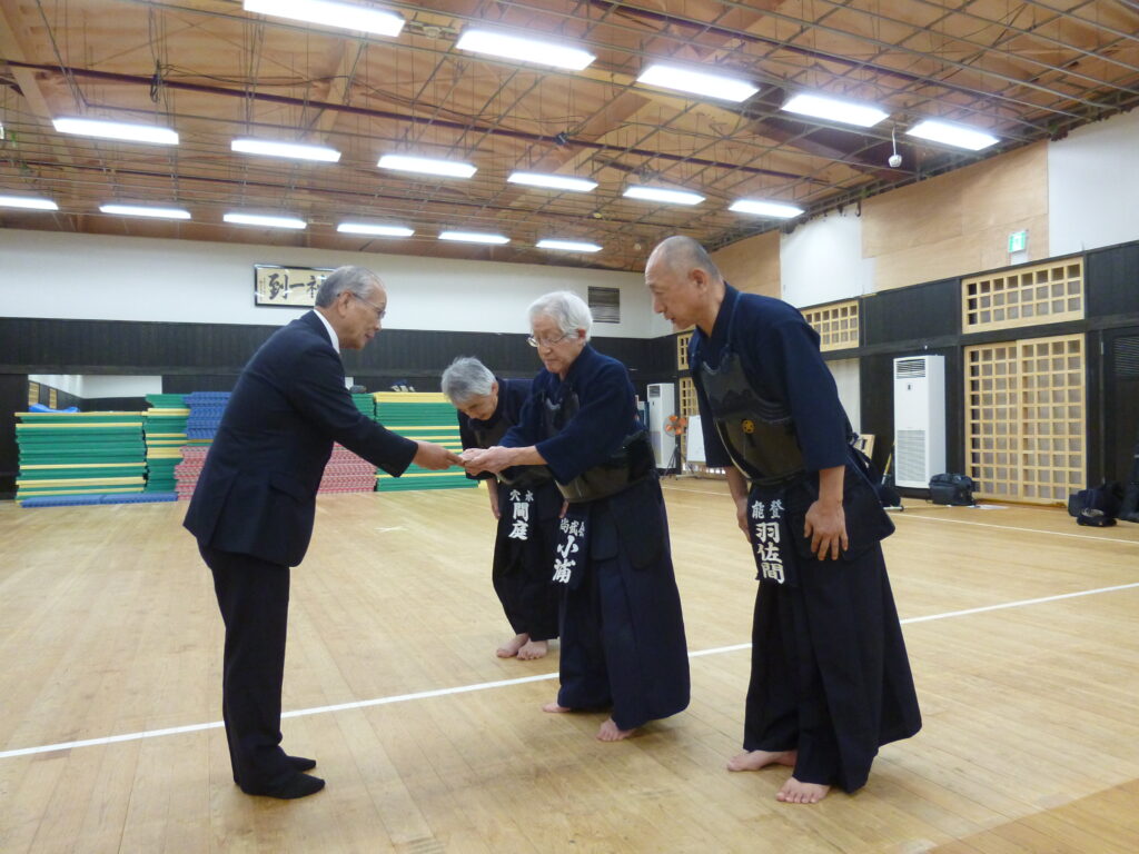 また、石川県剣道連盟 南会長から、小浦輪島市会長、間庭鳳珠郡会長にあさぎり翔成館から贈られた支援金が渡されました。。支援金は奥能登地区少年剣道大会に使用されます。